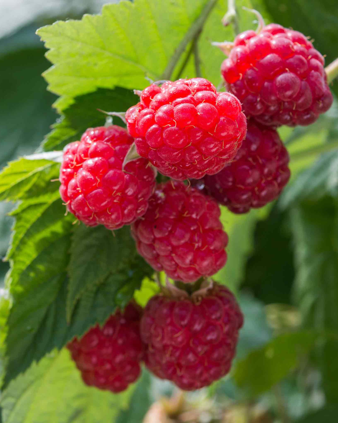 Autumn Bliss, has distinctive red berries, disease resistance and long cropping season from early August to first frosts, this short, strong caned variety has been the gardeners' choice for many years