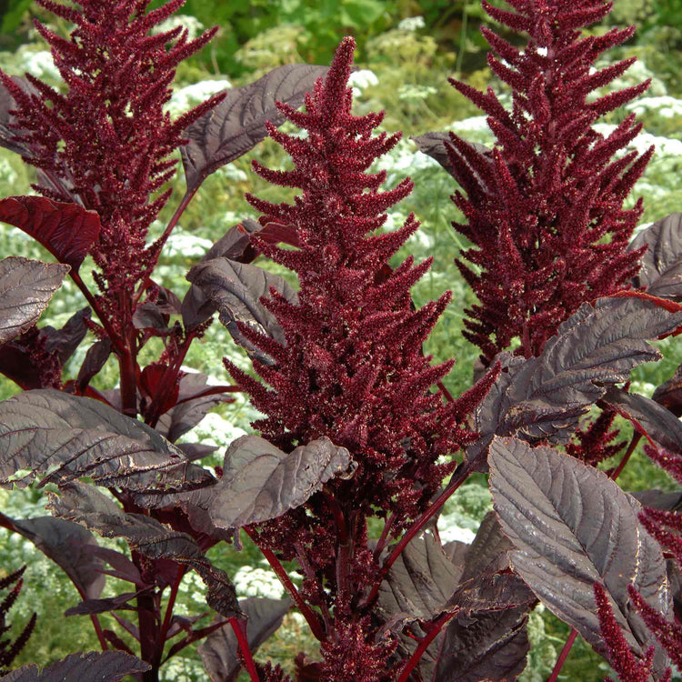 Amarathus ‘Velvet Curtains’ brings the look of the tropics to your garden with its dramatic red-purple foliage and tall crimson flower plumes. This award-winning half-hardy annual adds fantastic impact and structure to any sunny border.