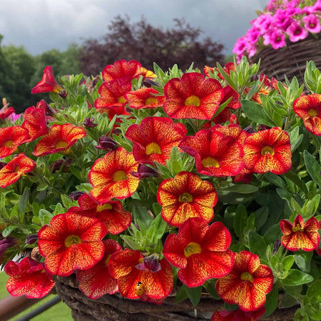 Calibrachoa ‘Can Can Oriental’ glows with gorgeous summer colour, adding warmth to pots and hanging baskets even when the sun isn’t shining! Flowering for months in summer and autumn, the compact plants are smothered in apricot-orange blooms streaked with warm red.