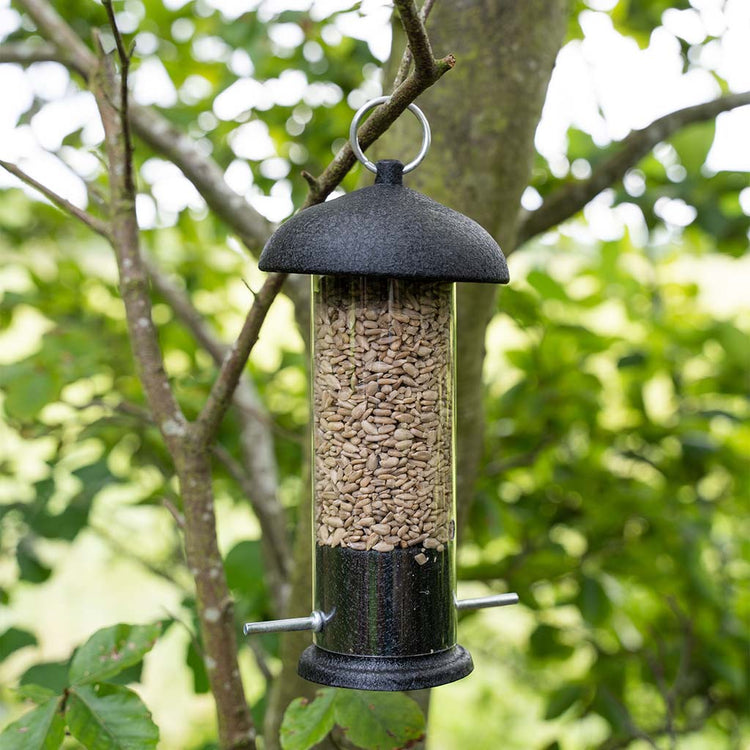 Standard Steel Sunflower Heart Feeder can hold 340g sunflower seeds. Easy to use, simply remove the lid.