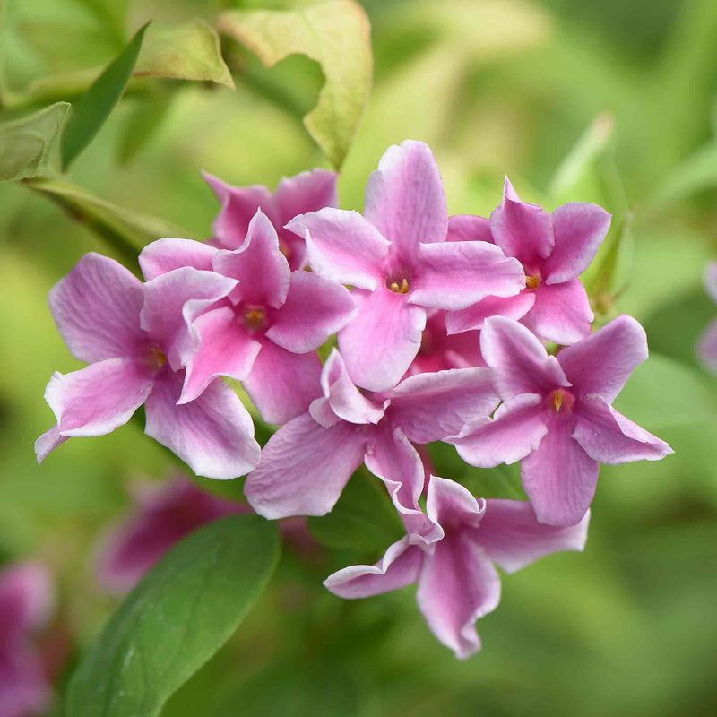 A beautiful deciduous climber with clusters of fragrant flowers in summer. The starry blooms are mauve-pink fading to white at the edges, with a heady perfume that fills the air. Ideal for covering a large wall or fence.