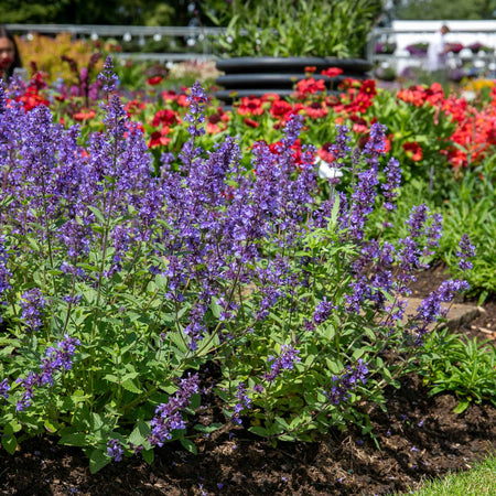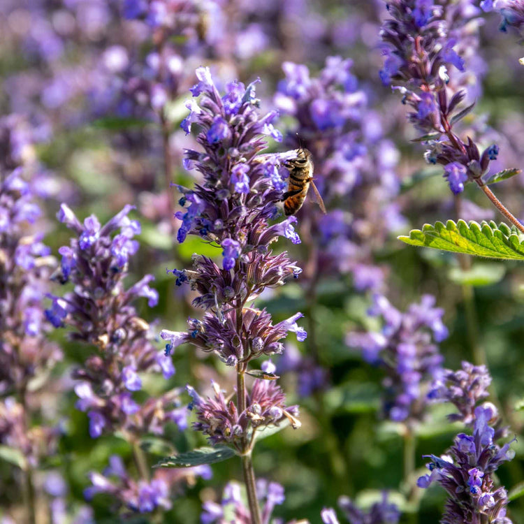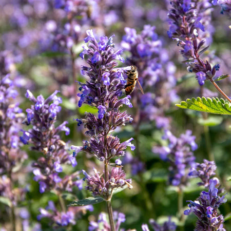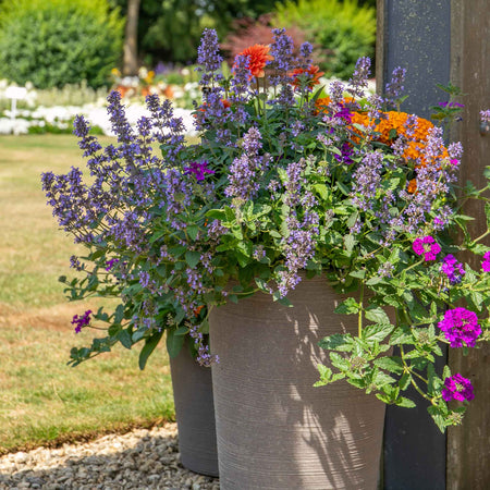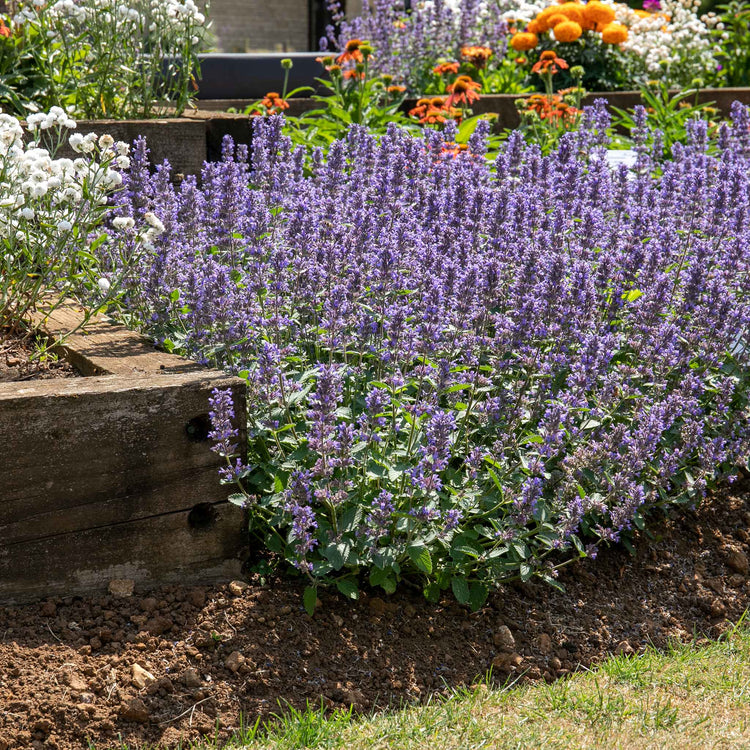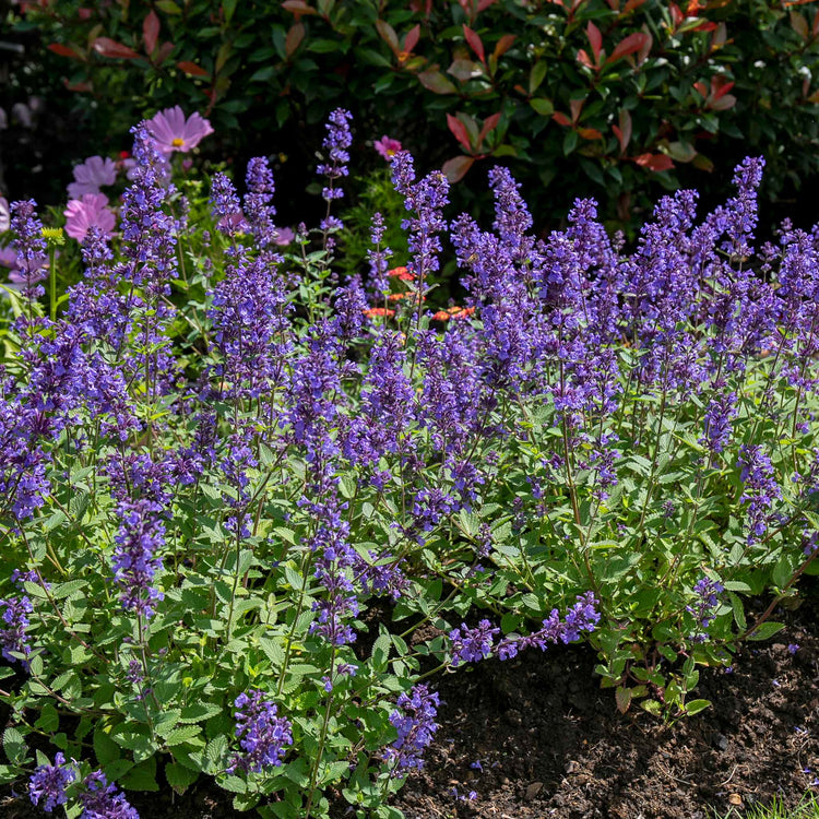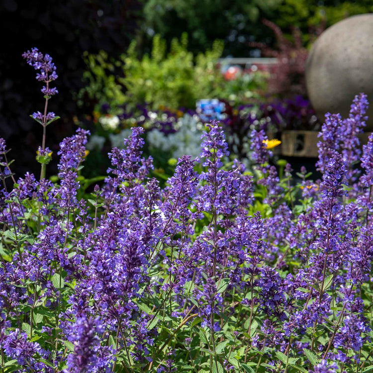 Long-flowering perennial Nepeta 'Whispurr Blue' is a cottage garden classic, bearing spires of large lavender-blue blooms above mounds of fragrant grey-green foliage for months. It’s ideal for the front of a large border, attracting butterflies and bees all summer and well into autumn.