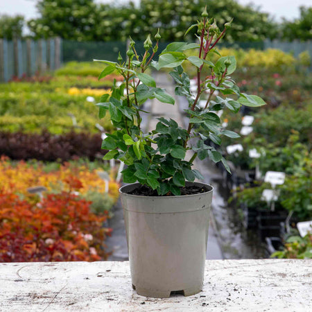 The rose itself is pruned to three or four main stems which form an open and attractive framework once the bud come into leaf and produce attractive young red-tinged leaves. Each stem is expertly pruned to just above a bud for healthy plant growth.