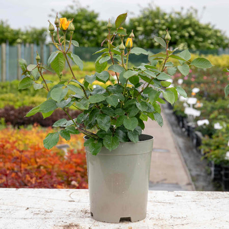 Floribunda rose ‘Precious Gold’ produces clusters of golden yellow semi-double fragrant flowers that stand out against glossy green foliage in summer and early autumn. The compact, bushy plants are ideal for containers and small gardens, with bronze flushed new spring foliage adding to their appeal. Rose ‘Precious Gold’ is healthy, hardy and tolerant of poor soils.