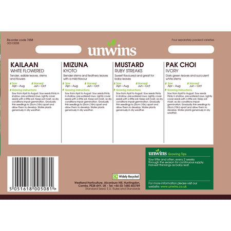 A great value pack of oriental leaves with spicy flavours. Easy to grow, collection includes Kailaan White Flowered, Mizuna Kyoto, Mustard Ruby Streaks and Pak Choi Ivory