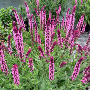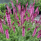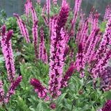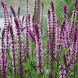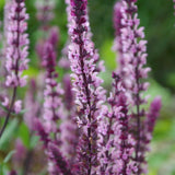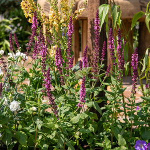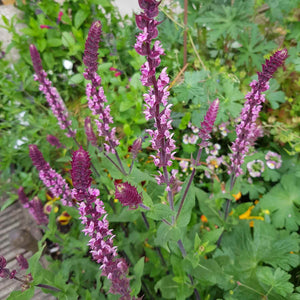Salvia nemorosa ‘Caradonna Pink’ is a lovely perennial for a sunny border, with deep pink buds held on dark stems and opening to soft pink flowers from early to mid summer. It does best in full sun, but will cope with some light shade. Very popular with bees and other pollinators, and drought-tolerant once established.