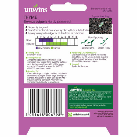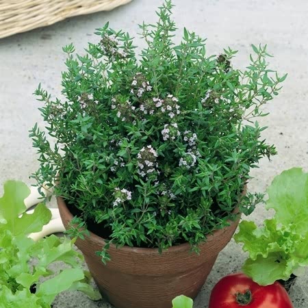 Thyme is a pretty little spreading perennial herb with small scented leaves. Excellent for cooking with poultry, meat and game, and flavouring soups.