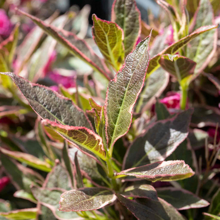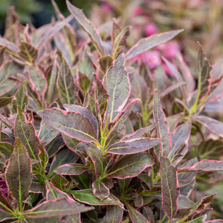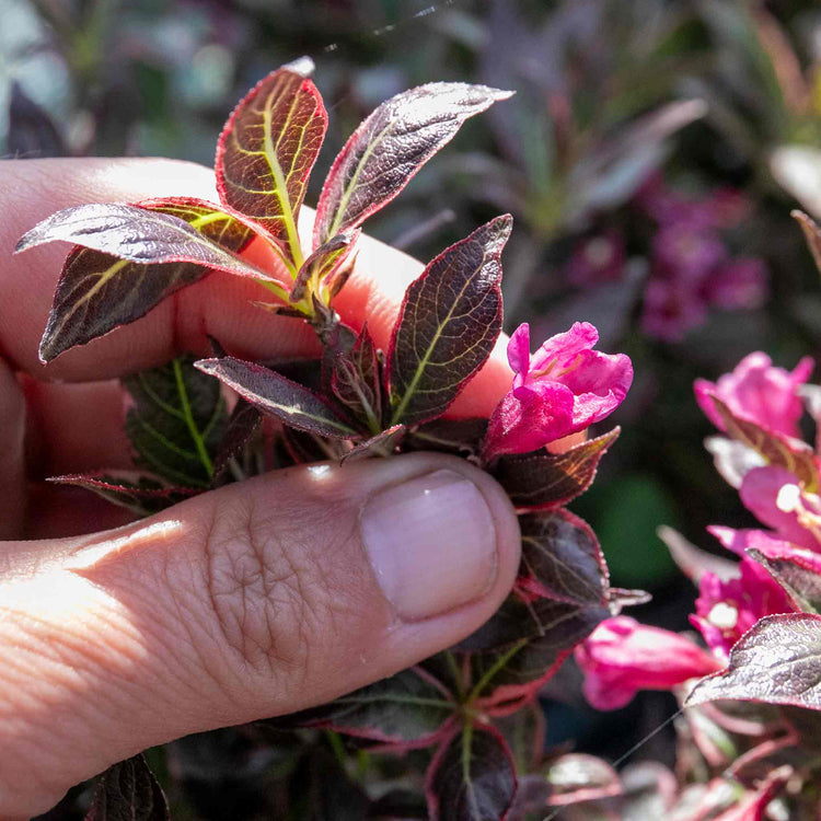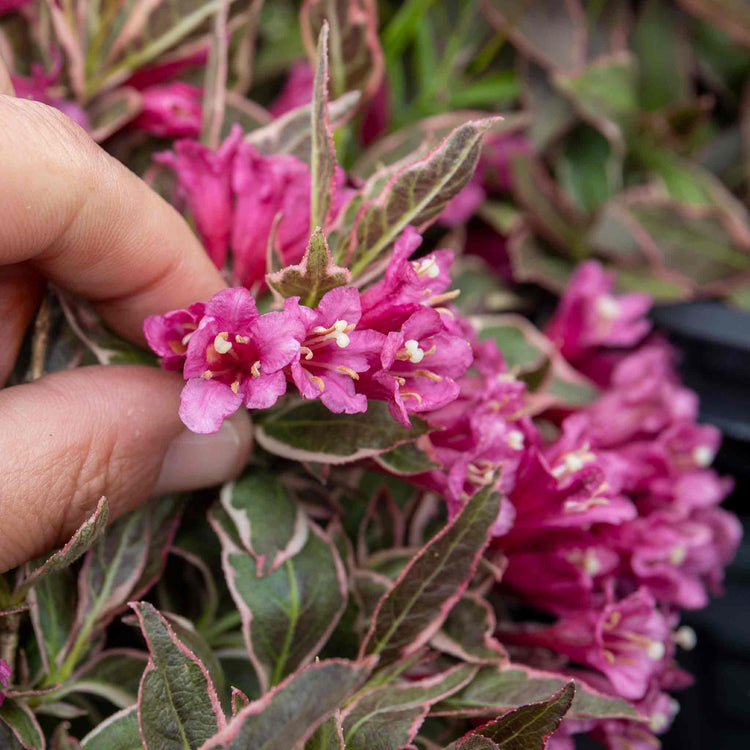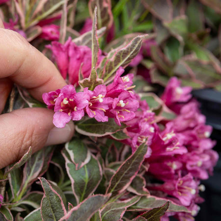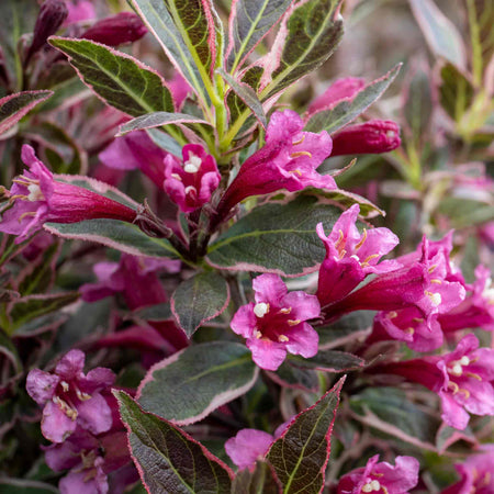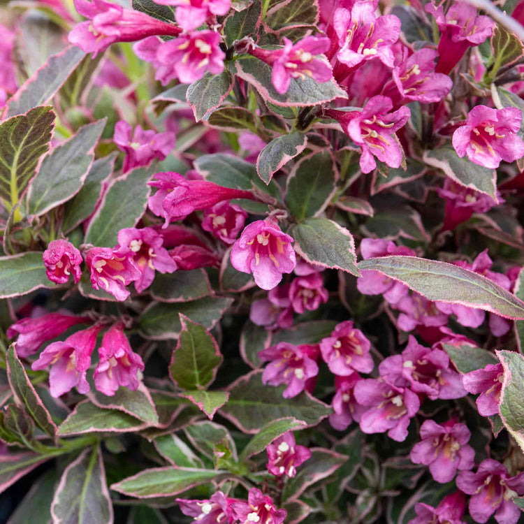 A good choice for a small garden, Weigela florida 'All Summer Monet' is a colourful dwarf shrub with green and cream-variegated leaves and deep pink flowers that keep coming from late spring through to autumn and are very popular with bumblebees. A low-maintenance, easy-to-grow deciduous shrub that can also be grown in a large container.